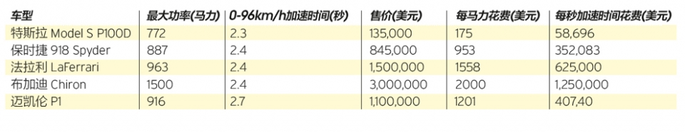 我收集了一些數(shù)據(jù),把功率、0-96公里/小時加速時間、價格這些數(shù)據(jù)放在一起,計算出了五輛高性能車每馬力的花費是多少,每秒加速時間的花費是多少。